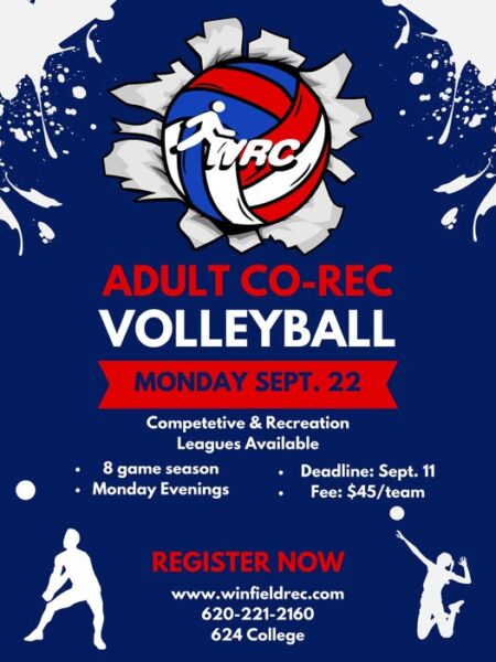 HomeFriendly Ford Hometown CalendarAdult Co-Rec Volleyball Adult Co-Rec Volleyball SHARE NOW Mon, Sep 8 at 9:00am - Thu, Sep 11 at 5:00pm Winfield Rec Center624 College St, Winfield Ks Register Map Add to My Calendar