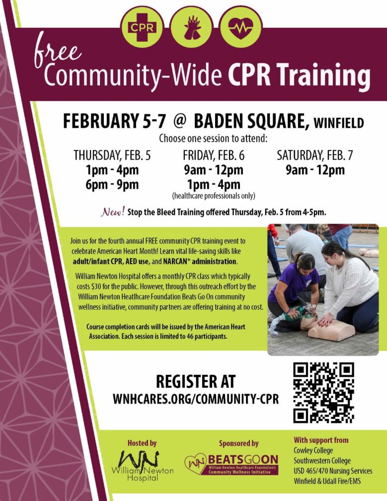 HomeFriendly Ford Hometown CalendarFREE CPR Training *MULTIPLE DATES/TIMES FREE CPR Training *MULTIPLE DATES/TIMES SHARE NOW Thu, Feb 5 at 1:00pm - Sat, Feb 7 at 9:00am Baden Square, Winfield700 Gary St. Winfield KS Register Map Add to My Calendar