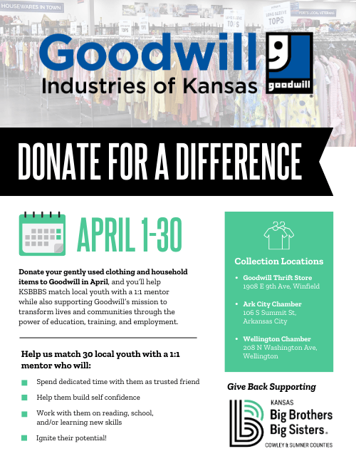 Take your items after your spring clean out or garage sale to Goodwill and mention Big Brothers Big Sisters and our youth will benefit. Collections will take place during the month of April at the store in Winfield, Arkansas City & Wellington Chambers of Commerce.