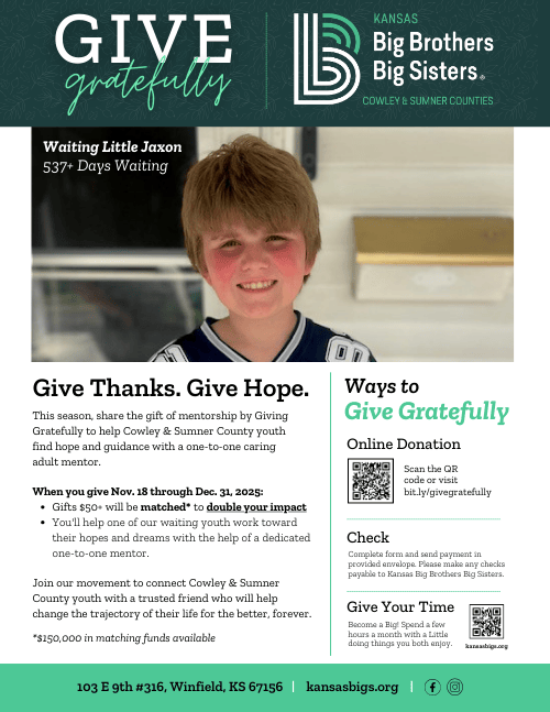 While funds last, a gift of $50 or more will be matched to benefit youth in our community. Please designate Cowley or Sumner Counties.