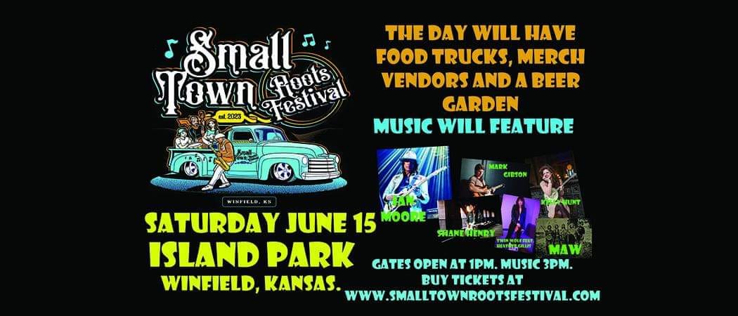 June 15th 2024 at 200 Main St Winfield, Kansas will be the Smalltown Roots Festival hosting 6 amazing artists playing blues, roots and soul music. The bridge will open at 1pm and music will start at 3pm. We will have mech vendors, food trucks, beer garden and music to supply you with plenty of fun for all ages. This event is FREE for under 16 with a paid admission adult. Get your advanced tickets at The Emporium 718 Main St Winfield. Kansas or online www.smalltownrootsfestival.com