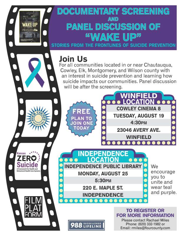 Join us for a free screening of Wake Up: Stories from the Frontlines of Suicide Prevention, followed by a community panel discussion. This powerful documentary shares personal stories and expert insights on the impact of suicide and the ways we can all help save lives. We’ll gather on Tuesday, August 19 at 4:30 PM at Cowley Cinema 8, and in Independence on Monday, August 25 at 5:30 PM at the Independence Public Library. Together, we can start conversations that matter and strengthen our community’s prevention efforts.