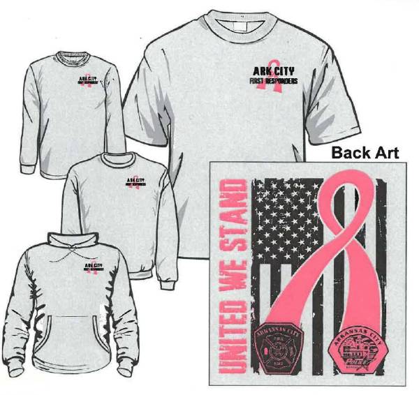 They are selling t-shirts designed by Arkansas City Fire/EMS Captain Brandy Rice. The logo reads “Ark City First Responders,” with a pink ribbon symbolizing cancer. The back of the shirt includes a pink ribbon, a U.S. flag, the logos of both departments and the words “United We Stand.”