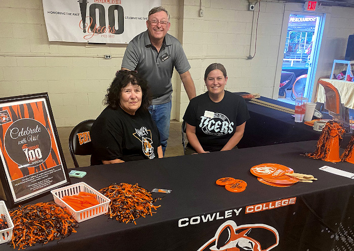 Cowley College Board of Trustees Member Brett Bazil visits the college’s booth at the Cowley County Fair in Winfield July 27, 2022. Bazil was elected as the new chair of the board this month. Those pictured at the booth were, from left, director of IMPACT programs Roxanna James, Trustee member Brett Bazil, and admissions representative Jordyn Rice. (Photo courtesy Cowley College)