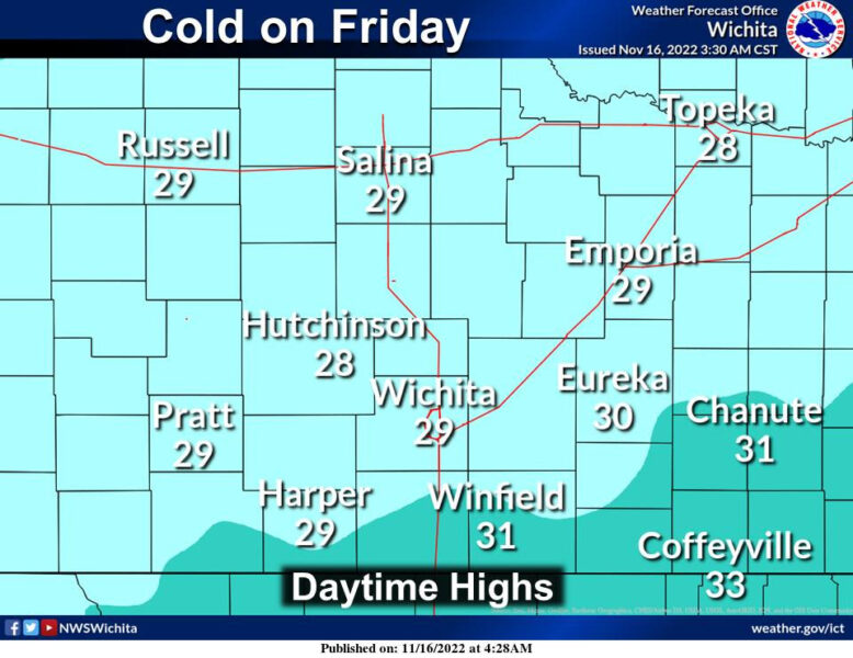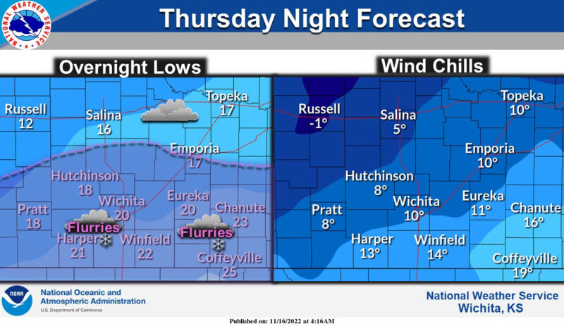 The coldest temperatures so far of the season are on the way overnight Thursday, according to the National Weather Service out of Wichita.